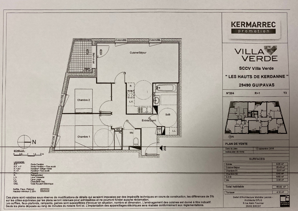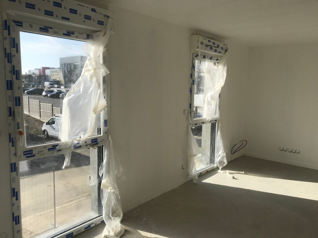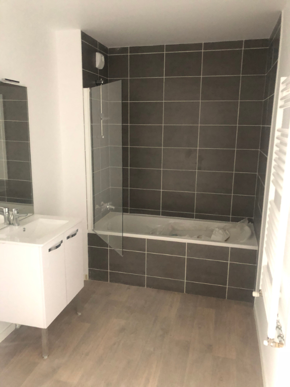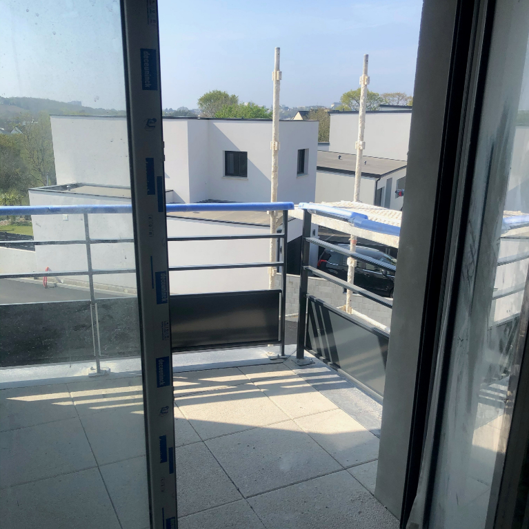 Appartement T3 état neuf à Guipavas comprenant une entrée, un séjour avec un coin cuisine aménagé et équipé, deux chambres, une salle de bains, un WC séparé et une loggia.