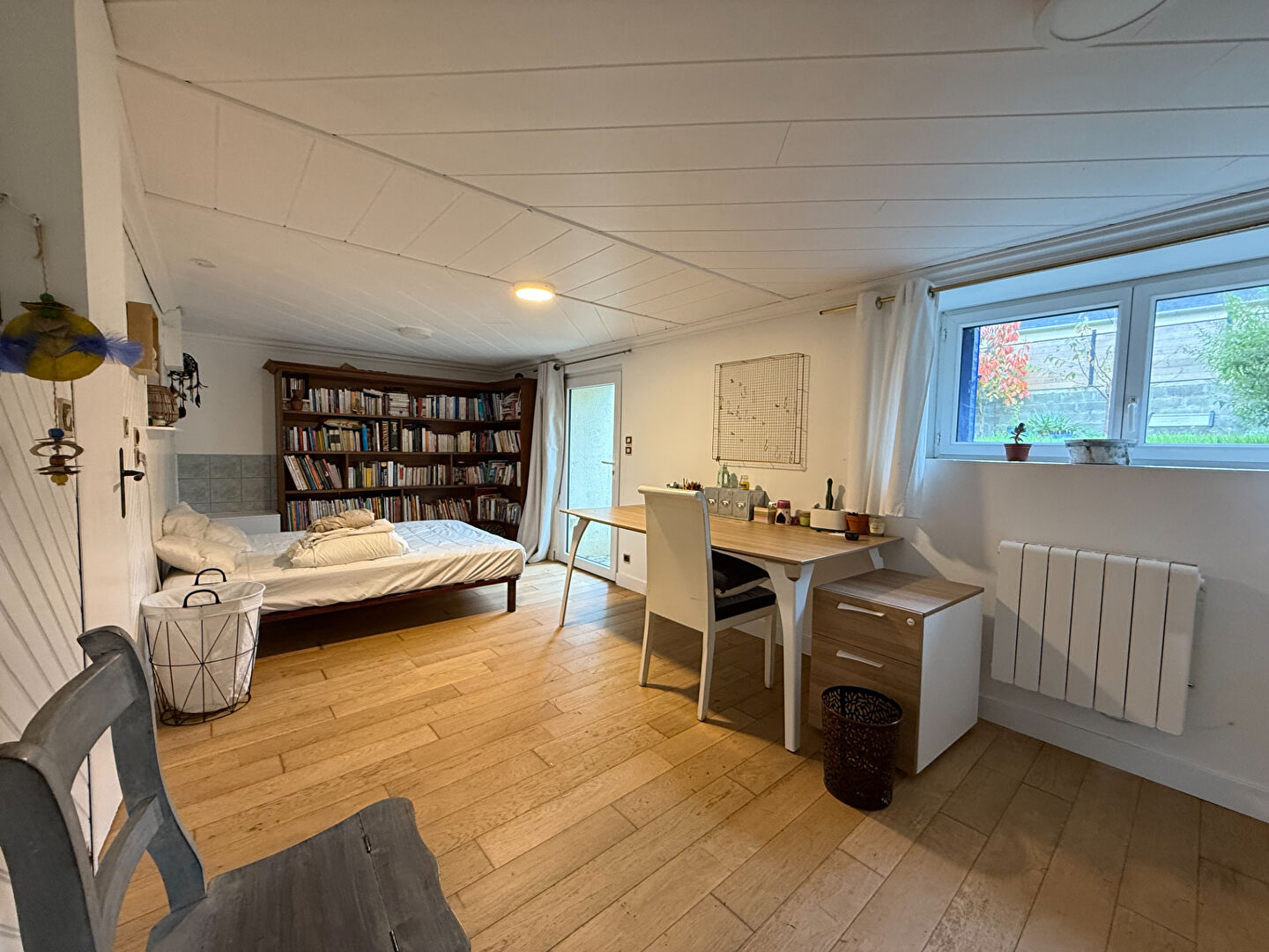 Coup de coeur maison atypique meublée comprenant au rez de jardin un hall d’entrée, chambre, salle de bains wc garage au rez de chaussé séjour salon avec poêle a bois cuisine aménagée, bureau avec mezzanine combles 2 chambres