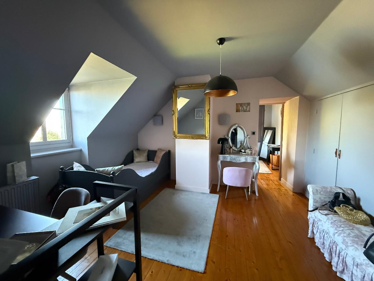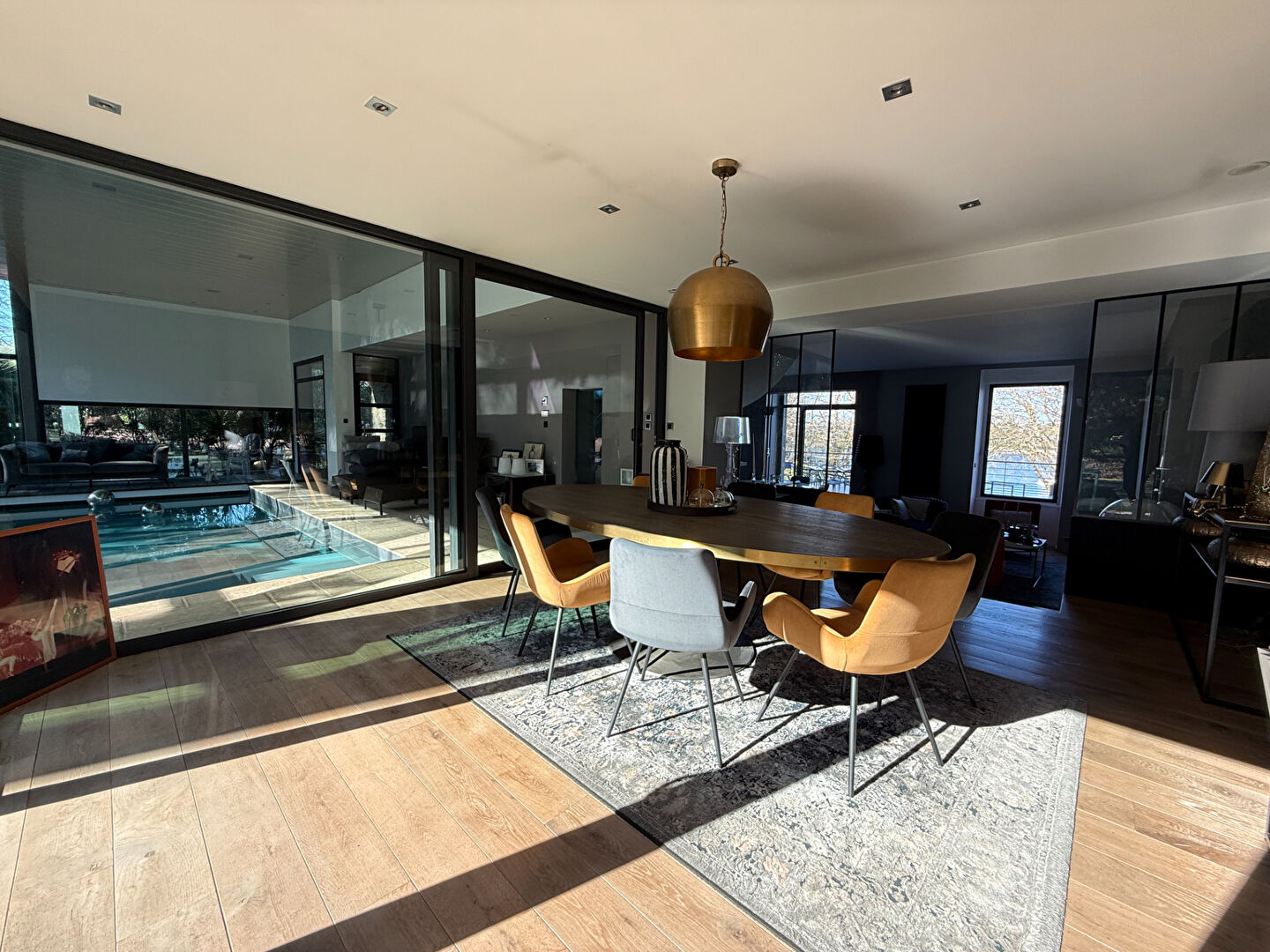 La maison développe 240 m² habitables et offre une entrée avec dressing, un séjour-salon lumineux avec cuisine aménagée ouvrant sur une vaste terrasse en bois exposée ouest, face à la mer. Un espace piscine chauffée d’environ 80 m² complète cet ensemble rare.